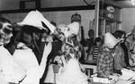 Description :UNE JEUNE VENDEUSE COIFFEE D'UN CHAPEAU DE PAILLE ET VETUE D'UNE CHEMISE A CARREAUX EST EN TRAIN D'ESSAYER UN CHAPEAU A UNE ACHETEUSE. UNE AUTRE VENDEUSE VETUE ET COIFFEE DE LA MEME FACON SE TIENT A DROITE. EN PLUS DES CHAPEAUX DE PAILLE, ON Y...