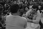 Description :DEUX HOMMES SE FONT FACE LA MAIN DROITE L'UNE DANS L'AUTRE, L'AVANT-BRAS DROIT TENDU, SOUS LES REGARDS ATTENTIFS D'UNE FOULE NOMBREUSE. DERRIERE EUX, SOURIANT ET AMUSE, ON RECONNAIT L'ANIMATEUR REMI CHARLAND.