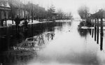 Description :VUE D'UNE RUE INONDEE. A GAUCHE, UN HOMME POUSSE UNE BROUETTE DANS LAQUELLE UNE FEMME ET UN ENFANT SONT ASSIS.