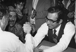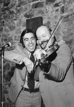 Description :PIERRE VILLAS EN COMPLET ET CRAVATE RIT EN TENANT TI-BLANC RICHARD PAR LES EPAULES; CE DERNIER TOUJOURS SOURIANT S'EXECUTE AU VIOLON DEVANT UN MICRO.