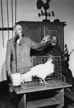Description :UN COQ VIVANT EST ENFERME DANS UNE CAGE, LAQUELLE EST POSEE SUR UNE TABLE BASSE EN BOIS. UN INDIVIDU PLACE DEBOUT DERRIERE LA CAGE, AVEC UN MICRO DEVANT LUI, REGARDE PROBABLEMENT VERS DES SPECTATEURS ET UN JURY. A L'ARRIERE-PLAN, TI-BLANC RICH...