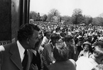Description :DES GENS SONT INSTALLES SUR DES TABLES A PIQUE-NIQUE POUR CASSER LA CROUTE. D'AUTRES SONT DEBOUT ET APPLAUDISSENT. LA SCENE SE PASSE A L'ARRIERE DU MONT NOTRE-DAME.