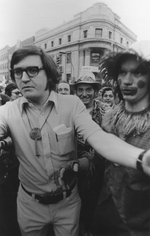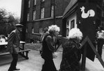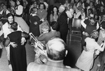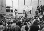 Description :JACQUES GAUVIN, MEMBRE DU COMITE ORGANISATEUR A L'AVANT-PLAN, TEND LES BRAS POUR ECARTER LA FOULE ET LAISSER PASSER CERTAINES PERSONNES DONT JEAN COLLARD ET MARC BUREAU QU'ON RECONNAIT PARMI CETTE MEME FOULE. UN CLOWN EST A DROITE. ON REMARQUE...