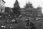 Description :LES JEUNES GENS, PAR GROUPE DE DEUX, TROIS OU QUATRE, SONT ASSIS SUR LE GAZON FACE A L'ACTUEL HOTEL DE VILLE. QUELQUES PERSONNES DEAMBULENT PARMI LE GROUPE. DE NOMBREUX MORCEAUX DE PAPIER JONCHENT LE SOL.