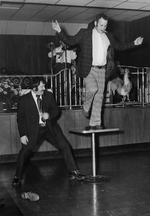 Description :UN HOMME, CIGARE A LA BOUCHE, EST MONTE SUR UNE TABLE POUR EFFECTUER UNE DANSE. A SA GAUCHE UN INDIVIDU PORTANT HABIT ET CRAVATE TIENT LA BASE DE LA TABLE DE SON PIED GAUCHE. A L'ARRIERE-PLAN ON APERCOIT UN VIOLONEUX.