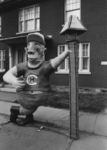 Description :LE BONHOMME GEANT A LE BRAS GAUCHE APPUYE SUR UN LAMPADAIRE FAIT DE PAPIER MACHE. IL PORTE UNE CASQUETTE ET UN CHANDAIL AVEC LE LOGO DU CANADIEN DE MONTREAL.
