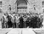 Description :PERSONNALITES DIVERSES GROUPEES DEVANT LES PORTES D'UNE EGLISE DE LA SARRE EN ABITIBI, ALORS QU'ILS ETAIENT CONVOQUEES POUR UNE REUNION REGIONALE DES CAISSES POPULAIRES DESJARDINS