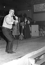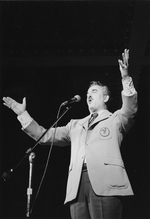 Description :M. BILODEAU CHANTANT LES BRAS ECARTES ET TENDUS VERS LE CIEL, MICRO DEVANT LUI. IL EST VETU D'UN VESTON ET PORTE L'INSIGNE DU FESTIVALS.