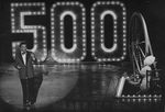 Description :LOUIS BILODEAU SE TENANT A GAUCHE, EN TENUE DE SOIREE, MICRO DEVANT LUI ET DERRIERE LUI UNE IMMENSE ENSEIGNE LUMINEUSE AVEC LE CHIFFRE 500. A DROITE UN ROUET ENTOURE DE PETITES LUMIERES.