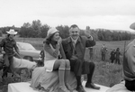 Description :M. BILODEAU SALUANT LES GENS DE SA MAIN GAUCHE. A SA DROITE UNE JEUNE FEMME (REINE OU DUCHESSE?). CONDUCTEUR DE DOS. DERRIERE EUX UN JEUNE HOMME PORTANT UN CHAPEAU DE COWBOY EST MONTE SUR UN PONEY. QUELQUES SPECTATEURS ASSISTENT AU DEFILE.
