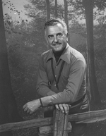 Description :M. BILODEAU SE TENANT DEBOUT POSEMENT, LA MAIN DROITE ET L'AVANT-BRAS GAUCHE APPUYES SUR UNE CLOTURE. DERRIERE LUI UN BOISE. LE DECOR A ETE RECREE EN STUDIO.