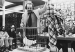 Sujet principal :JEAN COLLARD REGARDANT UN COQ VIVANT ENFERME DANS UNE CAGE LORS DU FESTIVAL DES CANTONS