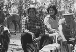 Description :MARC BUREAU VETU D'UNE CHEMISE A CARREAUX ET PORTANT UN CHAPEAU DE PAILLE EST MONTE SUR UNE CHARRETTE EN COMPAGNIE D'UNE FEMME. A DROITE DE LA PHOTO EST PLACE LE CONDUCTEUR TENANT LES RENES DE SA MAIN GAUCHE. A L'ARRIERE-PLAN DEUX AUTRES CHEVA...