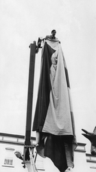 Description :MARC BUREAU EST MONTE TRES HAUT A L'AIDE DU BRAS D'UN CAMION-GRUE ET PORTE DANS SES MAINS UN IMMENSE DRAPEAU. LA PHOTO PRISE EN CONTRE-PLONGEE NOUS LAISSE DEVINER QU'IL DOMINE LE LAMPADAIRE DE RUE ET L'EDIFICE SITUE DERRIERE LUI.