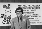 Description :JACQUES GAUVIN SOURIANT ET PORTANT VESTON ET CRAVATE EST PLACE DEVANT UN GRAND ECRITEAU OU L'ON PEUT LIRE "FESTIVAL DES CANTONS. FESTIVAL D'EXPRESSION AUTHENTIQUEMENT QUEBECOISE, SOUS TOUTES SES FORMES. ETC;".