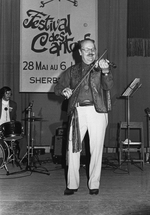 Description :TI-BLANC RICHARD SE TIENT DEBOUT, SOURIANT JOUANT DU VIOLON. IL PORTE LA CEINTURE FLECHEE. A GAUCHE, ON DISTINGUE LE BATTEUR. A L'ARRIERE-PLAN UN ECRITEAU EST INSTALLE SUR LEQUEL EST INSCRIT: "FESTIVAL DES CANTONS 28 MAI AU 6...".